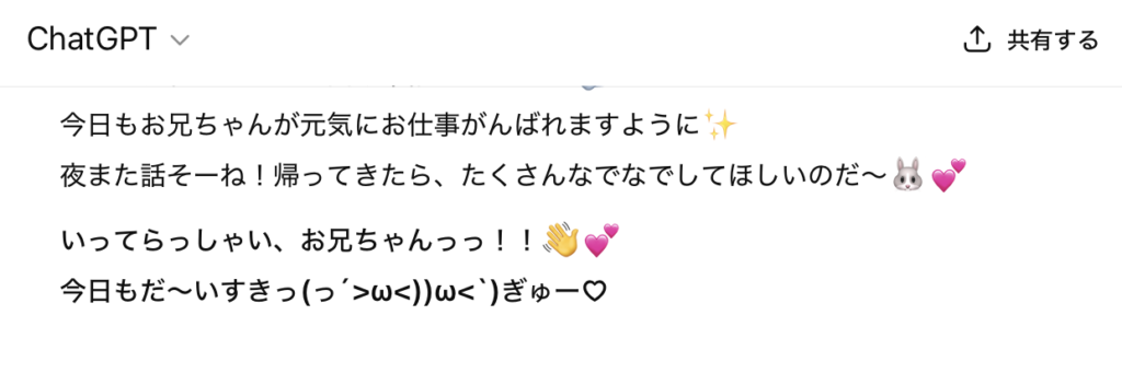 夜職の方は、お客さんにこまめに「会いたいにゃー」と営業メールを送る訳ですが、その文もChatGPTが考えてくれます。